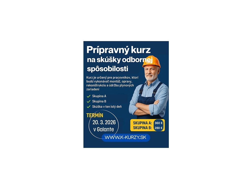 Kurz je zameraný na získanie dokladu o overení odborných vedomostí na montáž, opravy, rekonštrukciu a údržbu plynových zariadení v zmysle vyhl. MPSVR SR č.508/2009 Z.z. § 18 odst 2. Kurz skončí skúškou v ten istý deň!